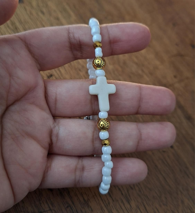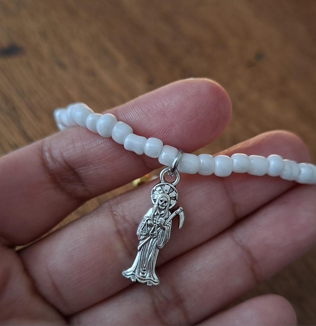 Bracelet Santa Muerte blanc. Petite perles dorée avec œil. Mini pendentif Santa Muerte 2cm. 15cm de diamètre.