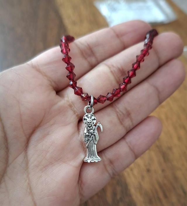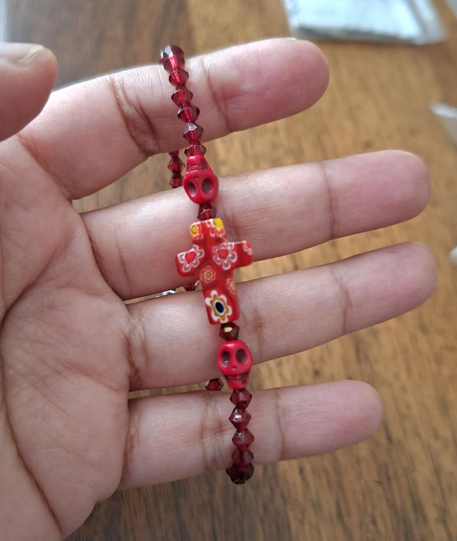Bracelet Santa Muerte avec croix chrétienne rouge en milfiori. Mini pendentif Santa Muerte 2cm. 17cm de diamètre