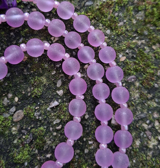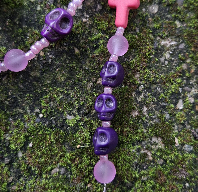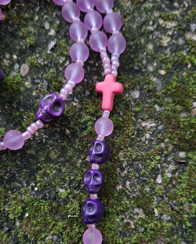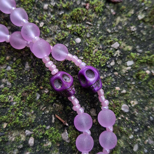 Chapelet Santa Muerte violet. Santita transparente, importée du Mexique et consacrée par moi-même. Perles rondes en verre givré. Perles crânes en howlite. Longueur 42cm.