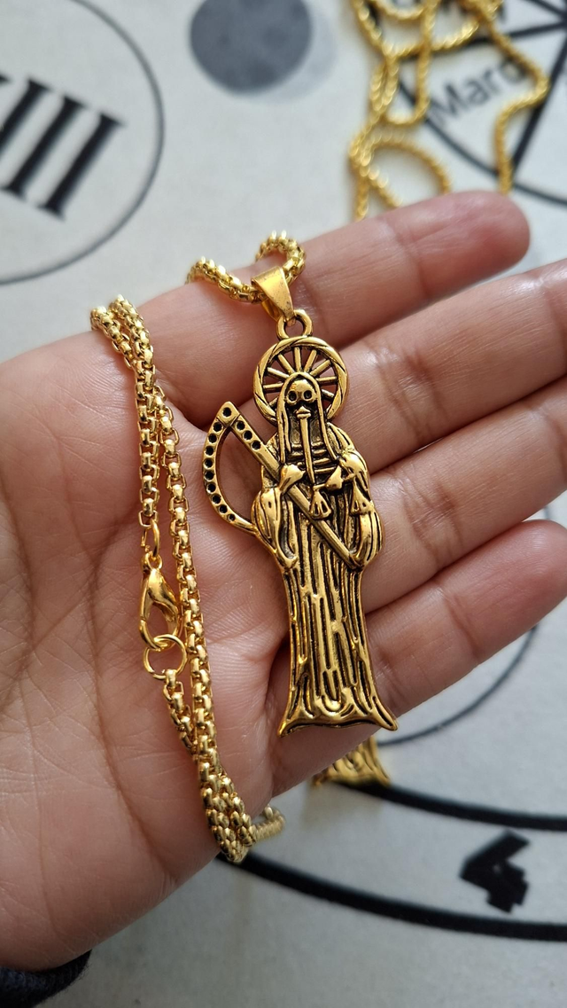 Pendentif Santa Muerte dorée avec chaîne. Pendentif 5cm. Chaîne 29cm.
