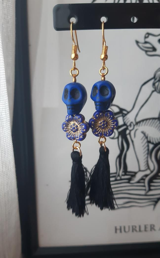 Perle tête de mort bleue en howlite, perle fleur bleue dorée en verre pressé diamètre 1,3cm, pompon noir. 6cm