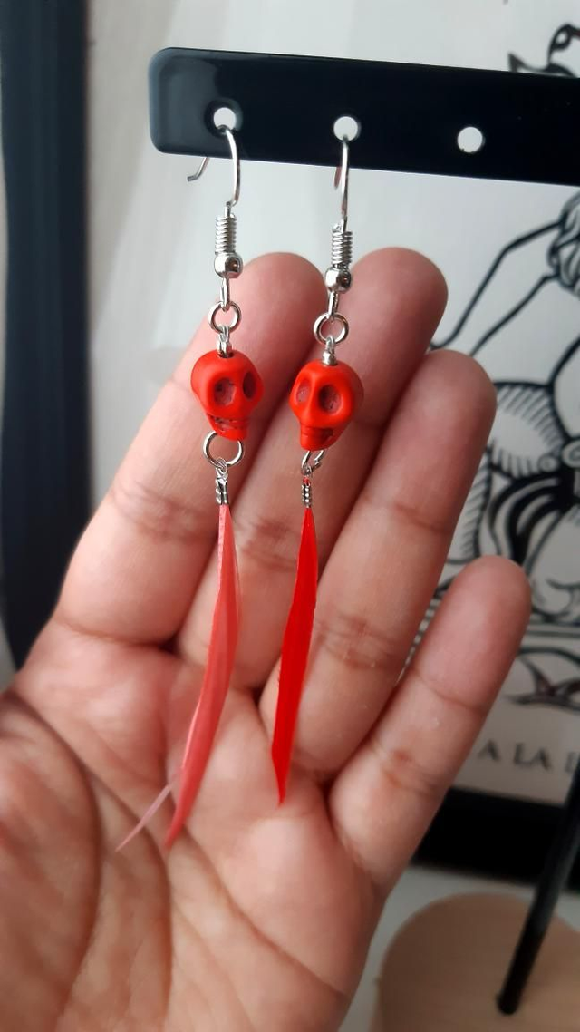 Petite perle tête de mort orange, plume synthétique orange : 6cm.