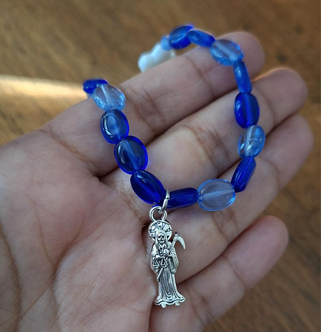 Bracelet Santa Muerte bleu, perles croix chrétienne contre le mauvais œil. Perles bleues transparente plates en verre. Mini pendentif Santa Muerte 2cm. 15cm.