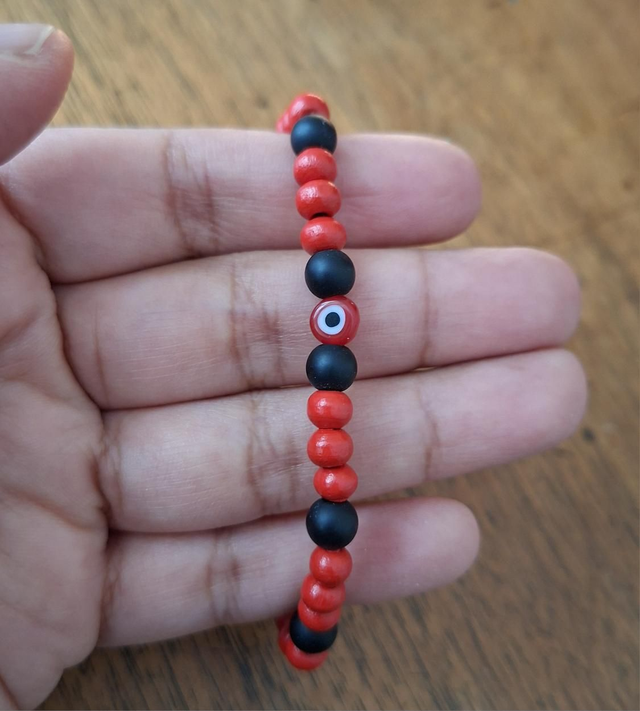 Bracelet Santa Muerte rouge et noir. Petites perles en bois 4mm. Perles rouge contre le mauvais œil. Mini pendentif Santa Muerte 2cm. 15cm de diamètre.