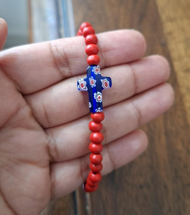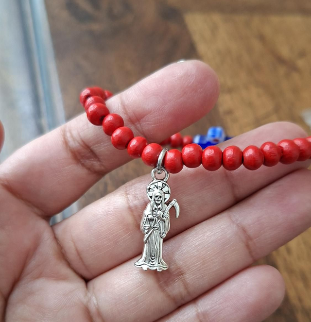 Bracelet Santa Muerte rouge, perle croix chrétienne en milfiori bleue. Mini pendentif Santa Muerte 2cm. 15cm de diamètre.